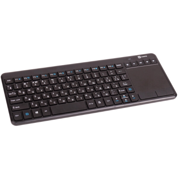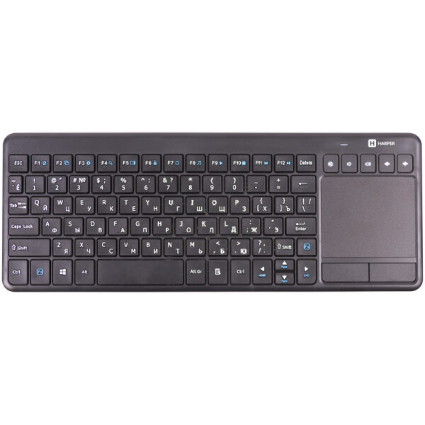Harper KBT-101 – это простая, легкая, надежная и очень функциональная беспроводная клавиатура. Подходит как для персональных компьютеров на базе ОС Windows, MacOS, так и для Android-устройств, SMART-телевизоров. Клавиши имеют короткий ход, легко нажимаются, рассчитаны минимум на 3 миллиона нажатий. 80 кнопок позволяют полностью заменить стандартную проводную клавиатуру. Доступны специальные комбинации нажатий для быстрого доступа к некоторым функциям (подробно описаны в инструкции). Отдельным блоком вынесены 5 клавиш для управления громкостью и перемоткой. Встроенный тачпад (сенсорная панель) с большим полем ввода полноценно заменяет манипулятор типа «мышь». Стандартные съемные батареи исключают необходимость ожидания подзарядки встроенных элементов.