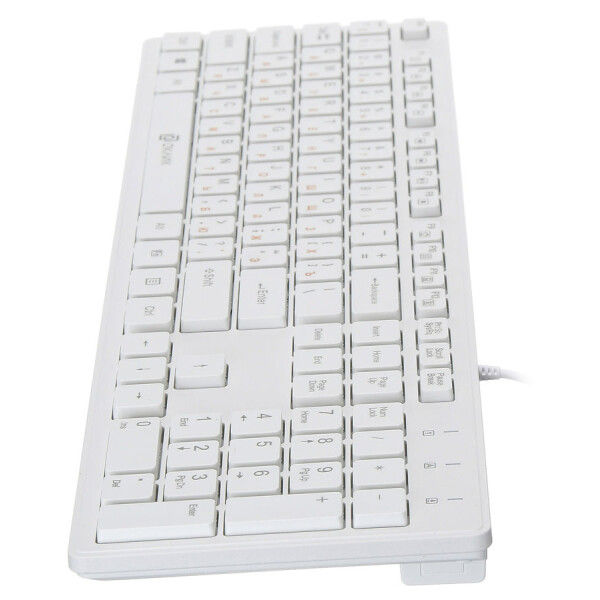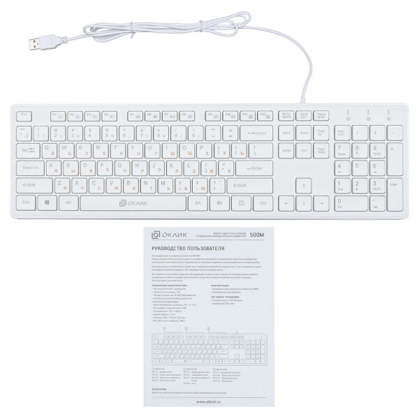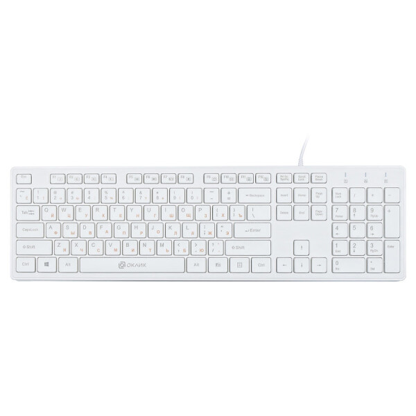 Slim-форма клавиатуры Oklick 500M с плоскими механическими переключателями способствует мобильности устройства. На белом фоне контрастно выделены знаки и блок NumPad для быстрого набора чисел.