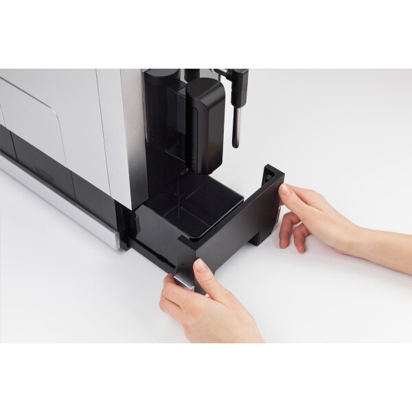Съемный поддон для капель закрепляется на корпусе на магнитах. Регулировка кофейного сопла осуществляется по высоте до 16 см. Реализованы функции предварительного смачивания кофе и подсветки чашки.
