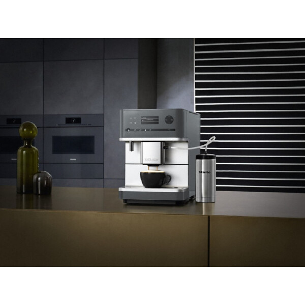 Miele CM6350 использует для приготовления эспрессо как молотый, так и зерновой кофе благодаря встроенной кофемолке. В емкость для зерен помещается 300 грамм продукта. Аппарат поддерживает сохранение индивидуальных настроек: количество кофе, степень помола, количество воды, температура заваривания и других параметров. Вы сможете также сохранить индивидуальный рецепт приготовления в памяти.