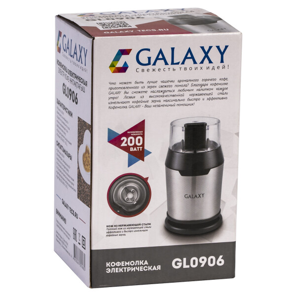 Кофемолка GALAXY GL0906 имеет стильный дизайн и прочный металлический корпус.