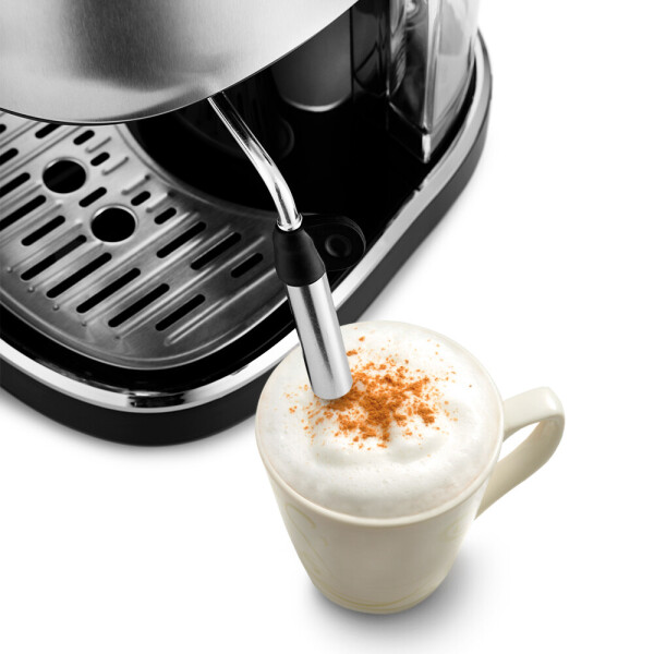 Капучинатор в кофеварке - это паровая трубка с насадкой панарелло. Трубку погружают в холодное молоко, включают подачу пара и взбивают молочную пенку. Приготовление не занимает много времени!