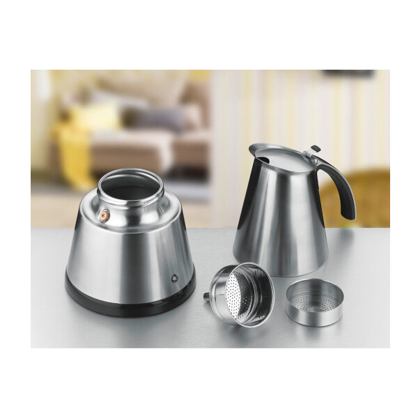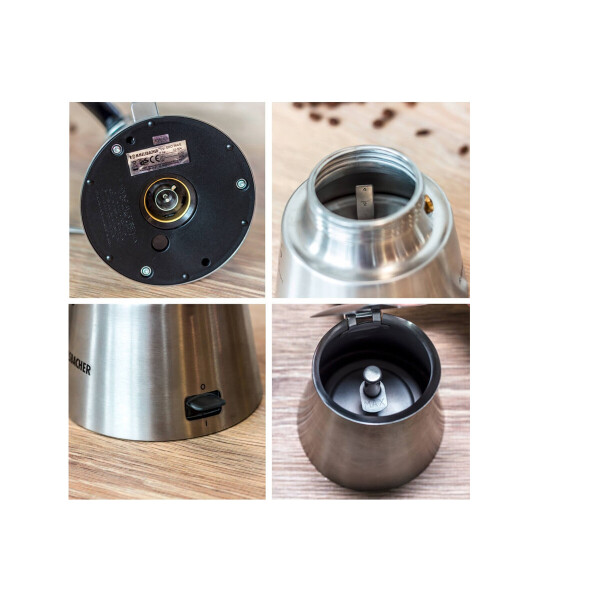 От перегрева и выкипания имеет защиту автоматическое отключение. Материал ручки не проводит тепло, поэтому ручка не нагревается. Лишнюю часть провода легко скрыть с глаз, смотав в специальный отсек. Небольшие размеры, простая конструкция модели, легкость в эксплуатации позволяют получить вкусный ароматный еспрессо и дома, и на работе.