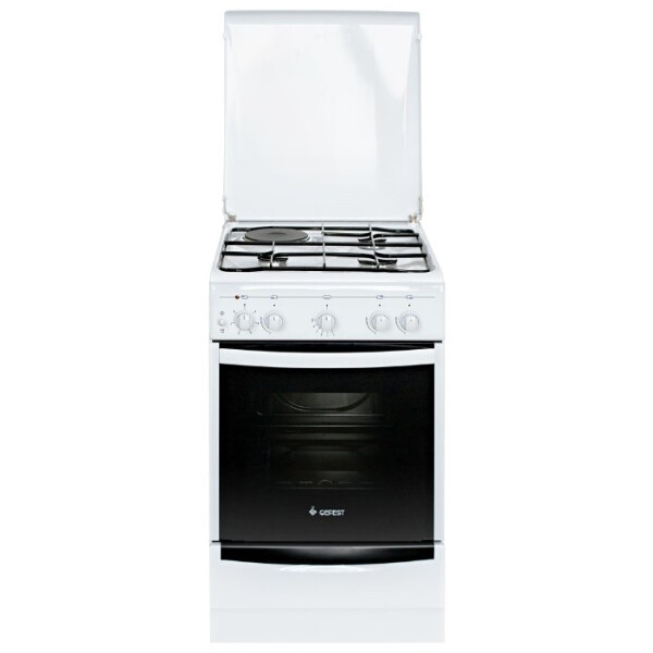 Белая плита шириной 50 см, поставляется с металлической защитной крышкой и выдвижным ящиком для хранения посуды и противней. Классический дизайн, современные материалы в отделке и индикация включения нагрева, все газовые горелки рабочего стола и духовки с электроподжигом.