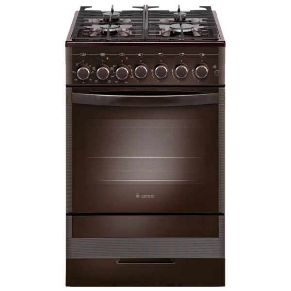 Комбинированная плита с газовыми конфорками и электрической духовкой, в коричневом цвете, ширина 50 см. Оснащена световой индикацией включения нагрева и электромеханическим таймером со звуковым сигналом. Классический дизайн выглядит вполне современно, фасад и рабочая поверхность - стеклянные.