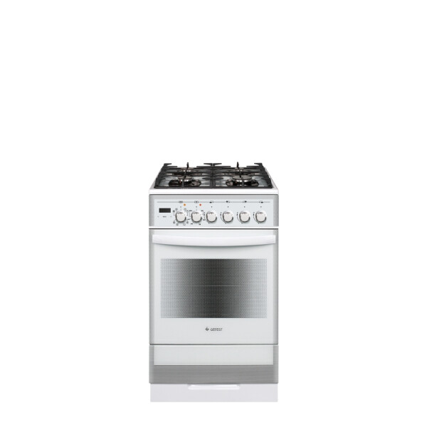 Белого цвета плита шириной 50 см, с газовой варочной поверхностью и электрической духовкой. Классический дизайн и современное техническое оснащение дополнены стеклянным покрытием фасада и рабочей поверхности. Поворотные ручки управления декорированы накладками, на панели расположен сенсорный таймер. Рабочий стол с 4 конфорками (две стандартные, большая и экономичная) оснащен автоматическим электроподжигом и газ-контролем. Горелки защищены чугунными решетками.