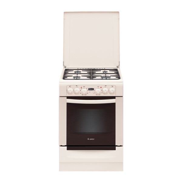 Полноразмерная комбинированная плита в кремовом цвете, с металлической защитной крышкой над варочной панелью, окрашенной в цвет фасада.