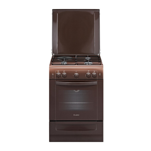 Варочная поверхность с нанесенной прочной эмалью, легкой в очистке. Три газовые конфорки различного диаметра и мощности дополнены чугунной электрической конфоркой. Жарочный шкаф оснащен термоуказателем нагрева и системой газ-контроля, перекрывающей газ в случае угасания пламени.