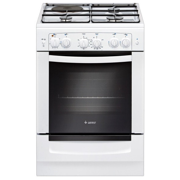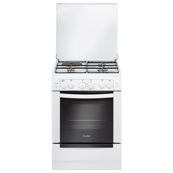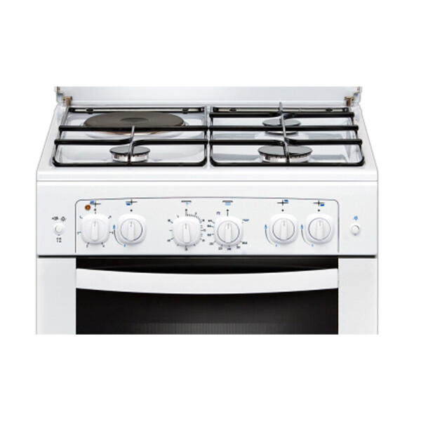 Белая газовая плита шириной 60 см, комплектация дополнена электрическими конфоркой рабочего стола и грилем, установленным в духовке. Обновленный дизайн и современный вид модели оставляет приятное впечатление, техническое оснащение позволяет пользоваться прибором легко и безопасно. Газовые горелки с электроподжигом.