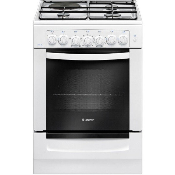 Современный дизайн, удобные элементы управления компактно расположены на передней панели. Есть и таймер, со звуковым сигналом. Варочная панель - комбинированная, три газовые горелки с электроподжигом дополнены чугунной электрической конфоркой.