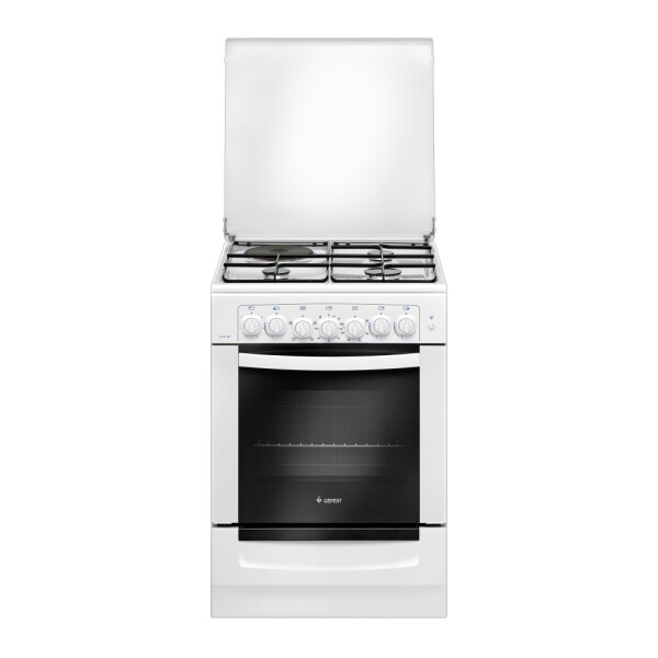 Белая газоэлектрическая плита шириной 50 см, фасад и рабочий стол покрыты прочной и устойчивой к истираниям эмалью, поставляется с металлической защитной крышкой и выдвижным ящиком для посуды.