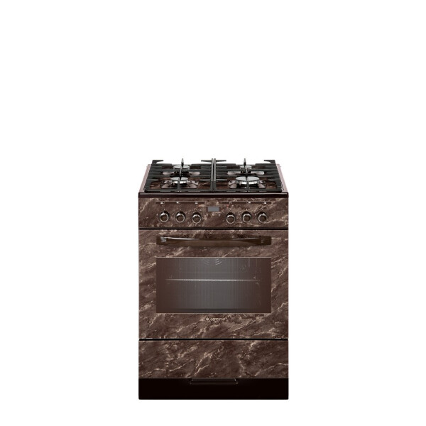 Комбинированная, газоэлектрическая плита шириной 60 см, коричневого цвета, на стеклянном фасаде рисунок, имитирующий мрамор.