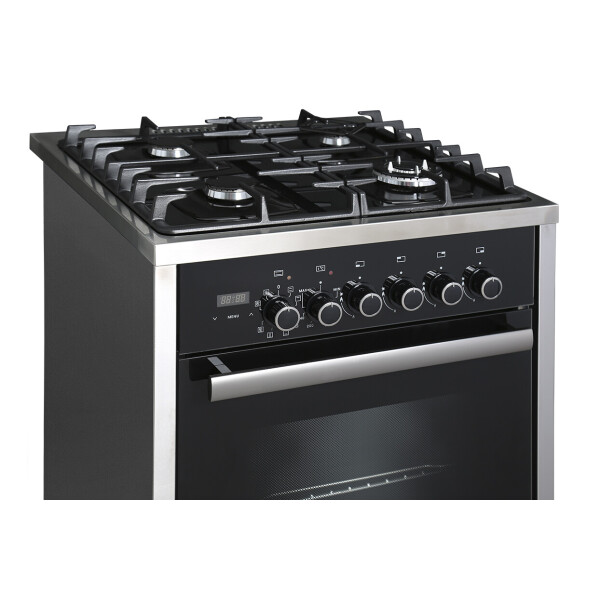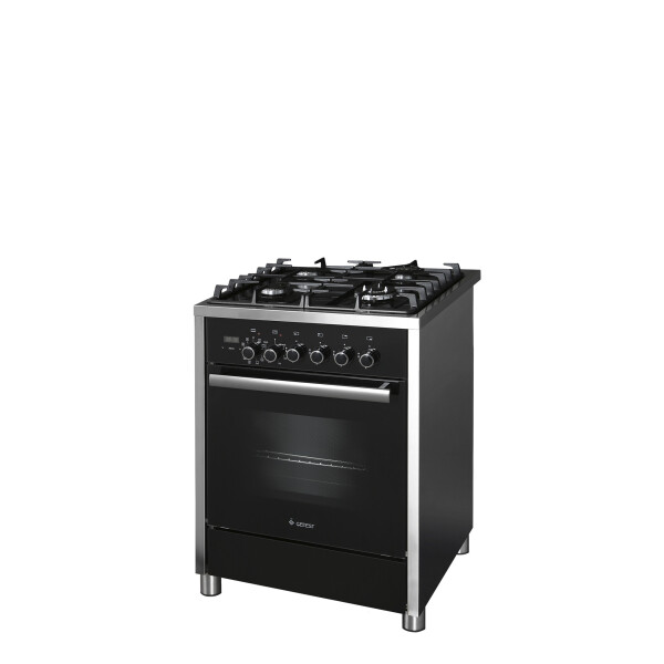 Черная комбинированная плита шириной 60 см, газовая рабочая поверхность и электрическая духовка. Дизайн дополнен декоративными элементами, фасад и покрытие рабочей поверхности - стеклянные. Все газовые горелки оснащены автоматическим электроподжигом и газ-контролем, помимо 2 стандартных и экономичной горелки, есть конфорка с двумя контурами пламени. На стекло устанавливаются фигурные чугунные решетки. Духовой шкаф с двухточечным освещением поддерживает классический нагрев с терморегулятором, режим гриля и ускоренный нагрев с конвекцией. В комплектации есть съемные вертел и шашлычница. На панели управления установлен многофункциональный сенсорный таймер, выполняющий роль часов, будильника и позволяющий запрограммировать отключение духовки через определенное время.
