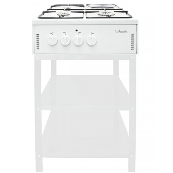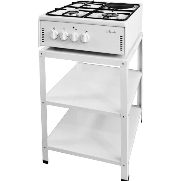 Плита идеально подойдет для дачи или мест, где необходимо использование разных источников энергии. А две просторные полки стеллажа позволят аккуратно разместить необходимую посуду и избежать беспорядка.