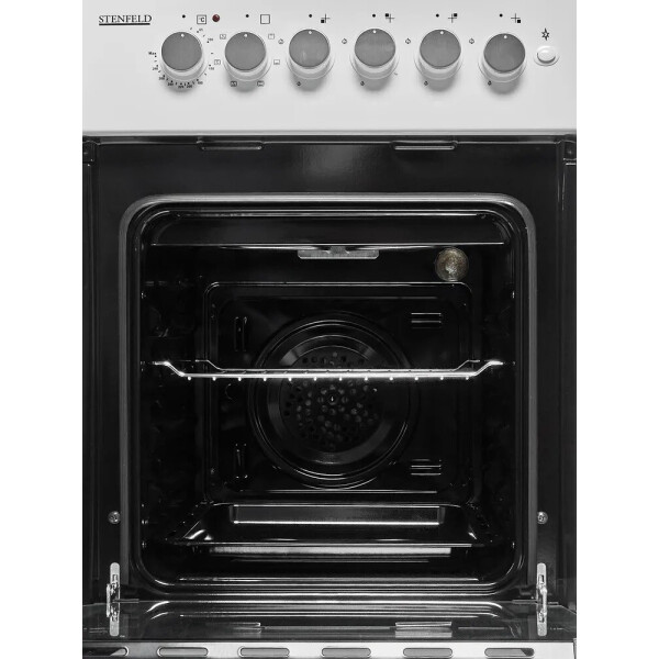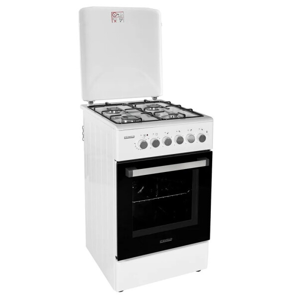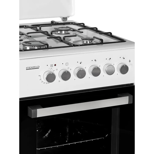 Комбинированная плита оснащена 4 газовыми конфорками и электрической духовкой на 55 л.