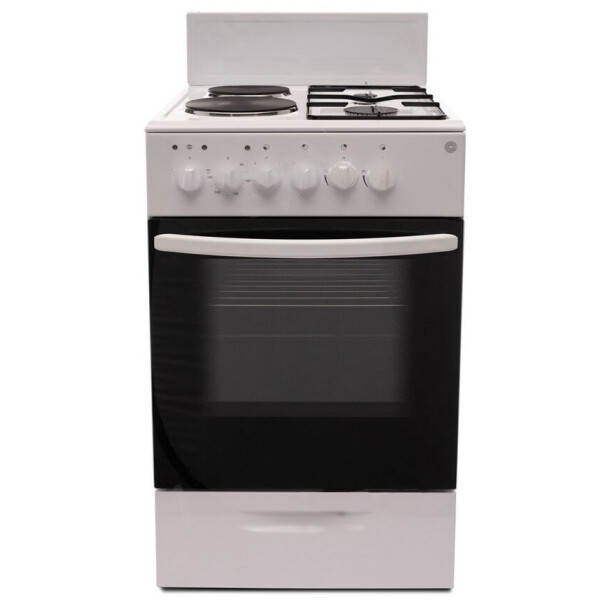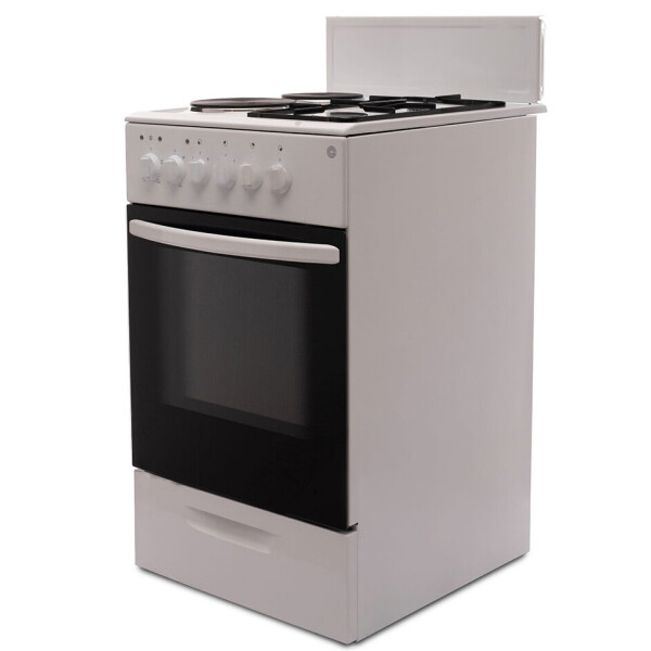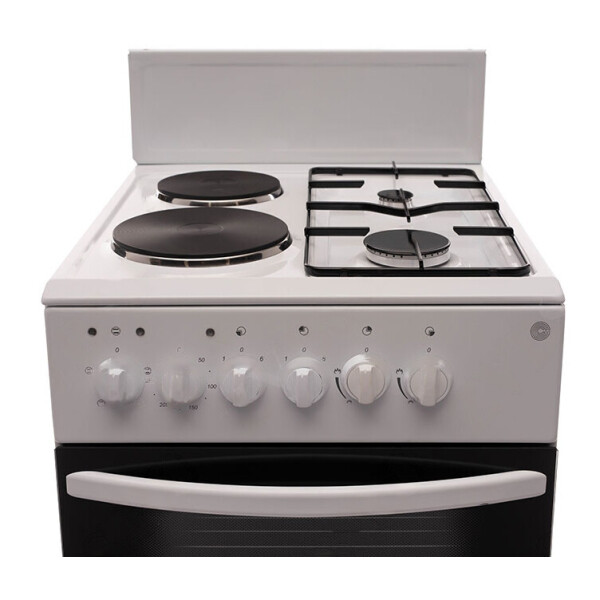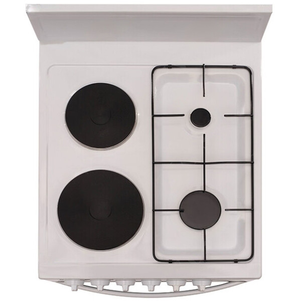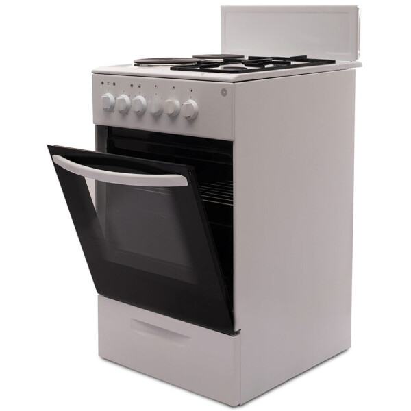 Комбинированная плита с шириной 50 см исполнена в элегантном белом цвете. Две газовые конфорки и две электрические управляются поворотными регуляторами, расположенными на передней панели. С таким простым управлением справится любой человек.