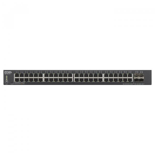 Smart коммутатор ZyXEL XGS1930-52 уровня Layer 2 Plus со скоростью коммутации 176Гб/с, таблица MAC-адресов составляет 16K, содержит 48 портов 1 Гб/с RJ-45, оснащен 4 слотами SFP+ 10 Гб/с.