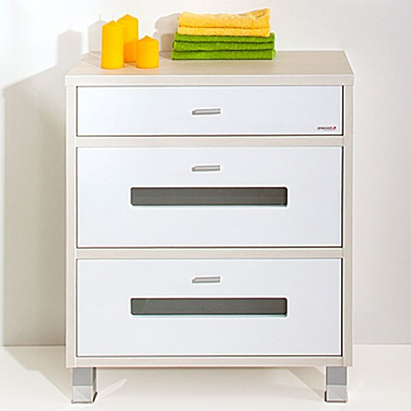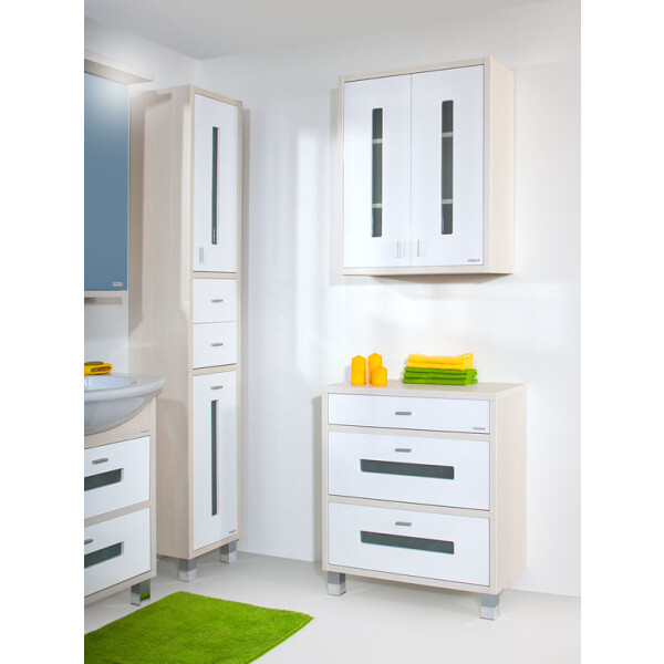 Удобный комод «Бали» предназначен для хранения полотенец, белья, халатов и прочих принадлежностей, необходимых в ванной комнате. Выполненная в современном стиле модель обладает массой функциональных достоинств: во-первых, изделие оснащено парой высоких выдвижных ящиков и одним – узким, кроме того, свободной остается поверхность комода; во-вторых, модель выполнена из качественного сырья, способного противостоять условиям влажной агрессивной среды, свойственной ванным комнатам.