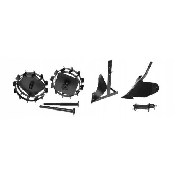 В данный набор навесного оборудования входят: Сцепка, Плуг, Колеса-грунтозацепы, Удлинители для грунтозацепов, Окучник.
