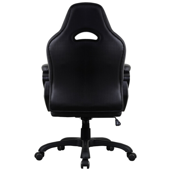 Использован механизм качания «бабочка». Кресло полностью окрашено в черный цвет, что придает предмету мебели солидность. Подголовник украшен логотипом производителя. Для перемещения кресла по горизонтальной поверхности используются 5 роликов. В комплектацию кресла входит инструкция по сборке и эксплуатации.