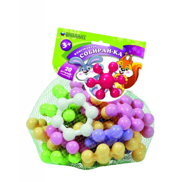 Конструктор "Собирай-ка" используется и как самостоятельная игра, и может быть приобретен в качестве дополнения к другим конструкторам Биплант. В набор входит 21 деталь необычной формы; округлые "колечки" и "ромашки". Они достаточно круглые — детали нельзя проглотить или случайно пораниться ими. Поэтому конструктор рекомендован для раннего развития малышей в возрасте от трех лет.