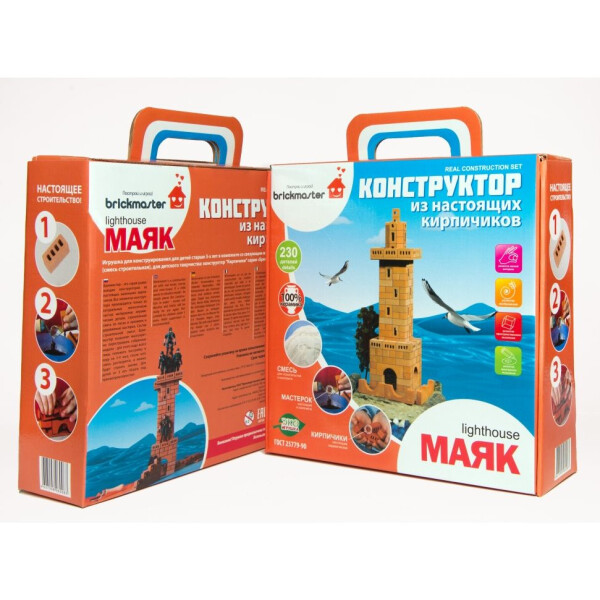 Набор Brickmaster «Маяк» - средний по размеру конструктор. В нем 230 кирпичиков различных форм и размеров, из которых ребенок самостоятельно возведет реалистичную мини-копию маяка. Конструкторы Brickmaster не похожи ни на одни другие. Элементы конструктора — это практически настоящие кирпичики. Они изготавливаются из обоженной глины по технологии настоящих кирпичей, но в меньшем размере. Кирпичики скрепляются между собой строительной смесью, как в большом строительстве. Эта особенность конструктора позволяет детально воспроизвести строительный процесс. Смесь для скрепления состоит из песка и крахмала, поэтому она совершенно безвредна. Она легко растворяется в воде, что позволяет многократно перестраивать уже собранное здание. Чтобы разобрать готовое сооружение, нужно просто опустить его в воду на несколько часов. Кирпичи от этого не пострадают. Их просто нужно будет просушить, и можно вновь начинать строительство.