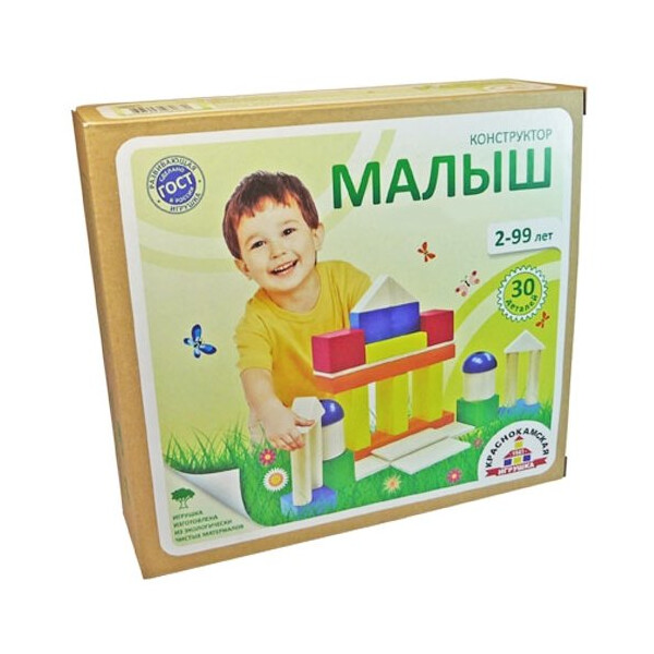 Конструктор "Малыш" состоит из деревянных строительных деталей. Эти простые формы помогут малышу построить любые конструкции, которые только придумает маленький фантазер – дорожки, дома, столы, стулья.