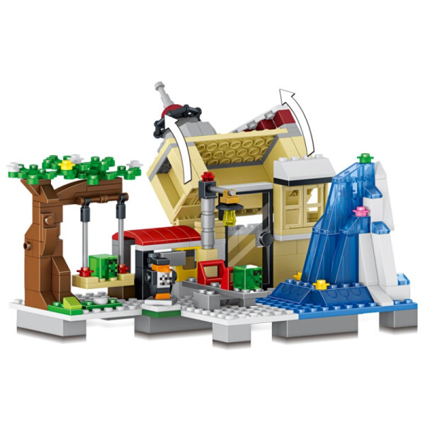 Реплика LEGO Minecraft – это игровая площадка, условно разделенная на три функциональные зоны. В ее правой части располагается покрытая снегом ледяная гора. Овечка, пасущаяся поблизости, ожидает возвращения в свой загончик. Маленькая серо-черная пристройка конструктора LELE My world с красной крышей, выступающая в его роли, служит неким соединением между одноэтажным домом современного типа и деревянной качелью.