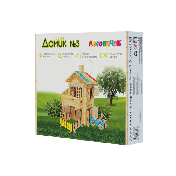 «Новый домик» — серия высококачественного деревянного конструктора отечественного производителя «Лесовичок». Самая яркая отличительная черта (от серии «Разборный домик») — наличие в комплекте большого количества дополнительных элементов и аксессуаров, позволяющих в полной мере реализовать потенциал юного архитектора и дизайнера. Ставни на окнах, двери, заборчики и даже транспортные средства во дворе... Внесение таких дополнений позволит композиции «заиграть» новыми красками, создаст уют. А если еще раскрасить часть элементов по своему вкусу, тогда творение будет полностью уникально.