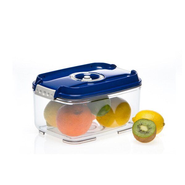Контейнер снабжён клапаном, совместимым с разными моделями вакууматоров, а также индикатором даты и месяца, помогающим контролировать срок хранения продуктов.