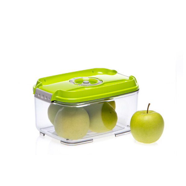 Контейнер снабжён клапаном, совместимым с разными моделями вакууматоров, а также индикатором даты и месяца, помогающим контролировать срок хранения продуктов.