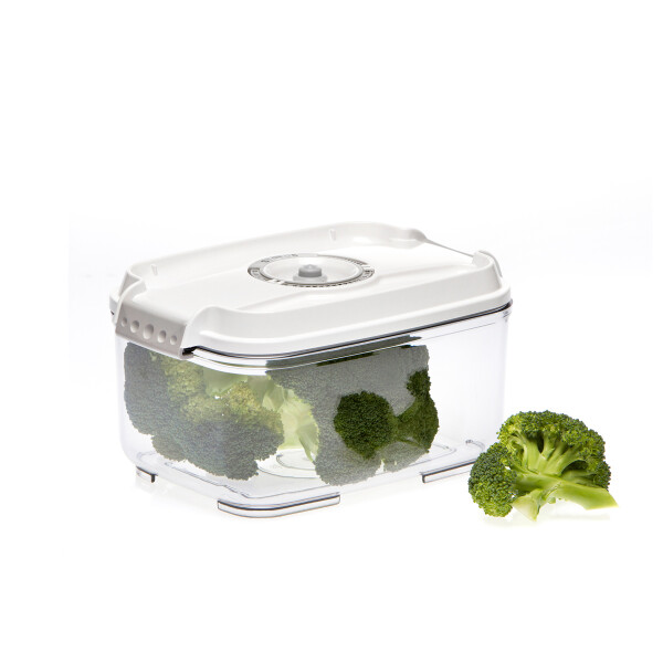 Контейнер снабжён клапаном, совместимым с разными моделями вакууматоров, а также индикатором даты и месяца, помогающим контролировать срок хранения продуктов.
