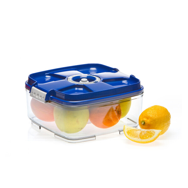 Контейнер снабжён клапаном, совместимым с разными моделями вакууматоров, а также индикатором даты и месяца, помогающим контролировать срок хранения продуктов.