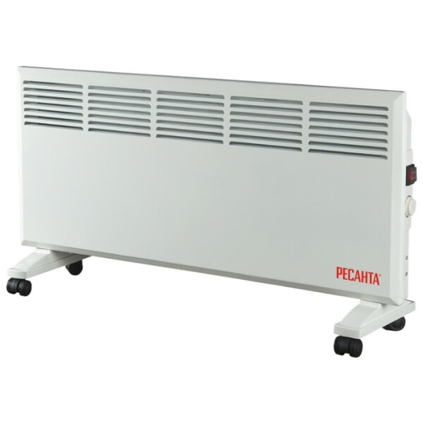 Электрический конвектор РЕСАНТА ОК-2000 для обогрева помещений. Состоит из нагревательной части (ТЭН), заключенной в нижней части корпуса со щелеобразными отверстиями снизу и жалюзи в верхней части. Данная конструкция даёт возможность воздуху беспрепятственно проходить внутри конвектора,