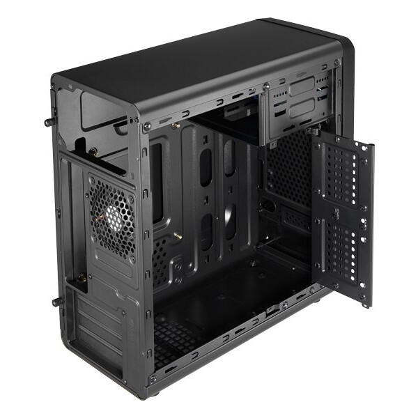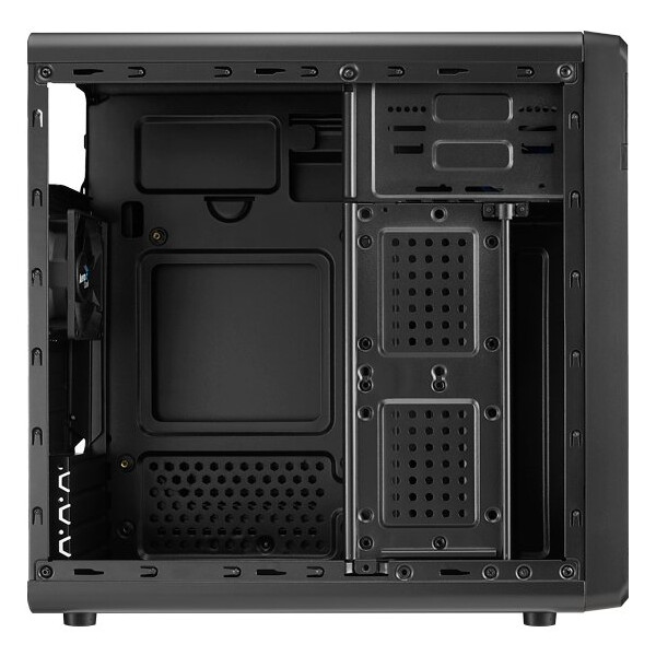 Внутри Micro ATX AeroCool Qs-180 Black уже установлен один вентилятор 80х80 мм и есть два места для монтажа дополнительных вентиляторов 120х120 мм. Накопители 3.5" устанавливаются в два отсека внутри, и один снаружи. Также предусмотрено место для накопителей 2.5" и 5.25". ПК можно улучшить за счет четырех слотов расширения. Для удобства и оперативности взаимодействия с внешними устройствами на передней панели размещены USB-разъемы различных спецификаций: два USB 2.0 и один USB 3.0. Там же находятся стандартные разъемы для микрофона и наушников.