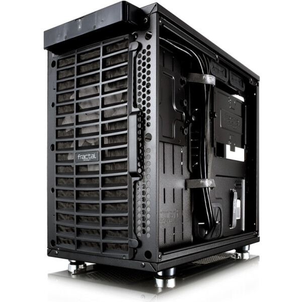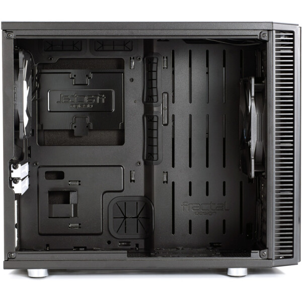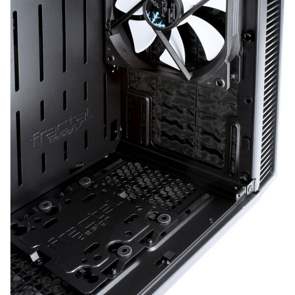 Внутреннее пространство Fractal Design Define Nano S рассчитано на одновременную установку шести вентиляторов (два вентилятора идут в комплекте и уже предустановлены) и, кроме того, системы водного охлаждения (СВО). Для СВО даже предусмотрено специальное крепление (для помпы и емкости с охлаждающей жидкостью). Также в корпусе можно поместить и подключить для одновременной работы до четырех винчестеров. Внутренняя архитектура позволит удобно распределить все соединительные кабели, для чего предусмотрены специальные липучки для захвата проводов.
