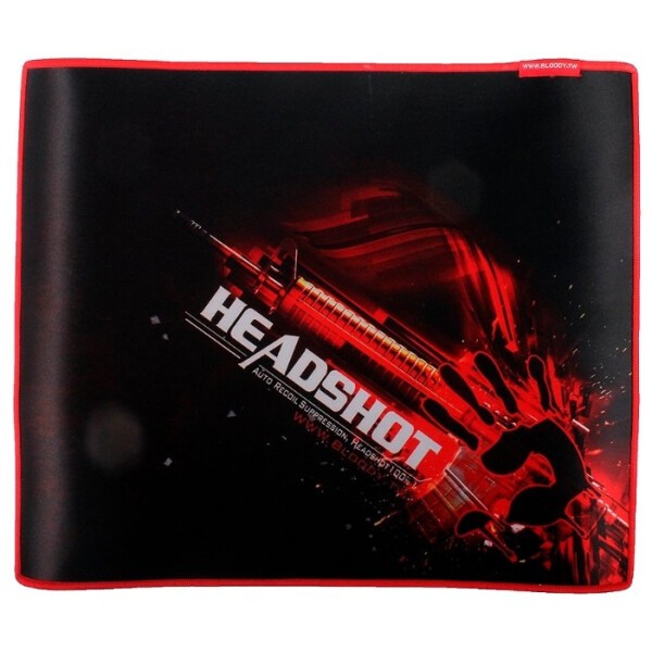 Коврик A4Tech Bloody B-070 своим дизайном привлечет внимание любителей шутеров. Принт выдержан в черно-красной гамме. Отпечаток руки, алый автомат и серая надпись HEADSHOT ассоциируются с ожесточенными кровавыми боями. По своим размерам коврик большой (430×350 мм), что расширяет свободу и размашистость движений руки. Плотная резина основания (4 мм) хорошо фиксирует аксессуар на месте.