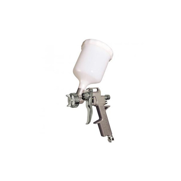 Краскораспылитель выполнен из алюминиевого сплава, оснащен баком объемом в 0.5л. Есть возможность регулировки воздуха и потока краски.