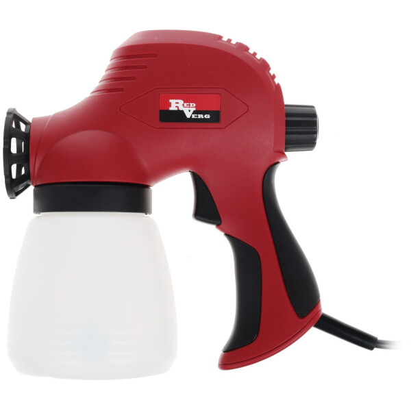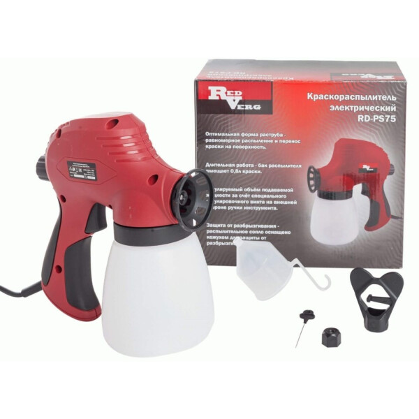 Устройство предназначено для нанесения лакокрасочных изделий вязкостью до 80 Din-сек Оптимальная форма раструба для равномерного распыления краски на поверхность. Бак распылителя вмещает 800 мл. краски. Регулировка объема краски подаваемой на сопло.