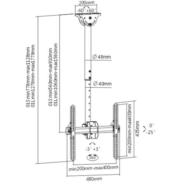 Потолочный кронштейн для LCD/LED телевизоров размером от 26 до 65 дюймов с максимальным весом до 55 кг. с возможностью крепления на наклонный потолок. Надежная стальная конструкция. Регулировка наклона 0-25 и углом поворота ±180 градусов. Максимальные крепежные размеры 400×400 мм.