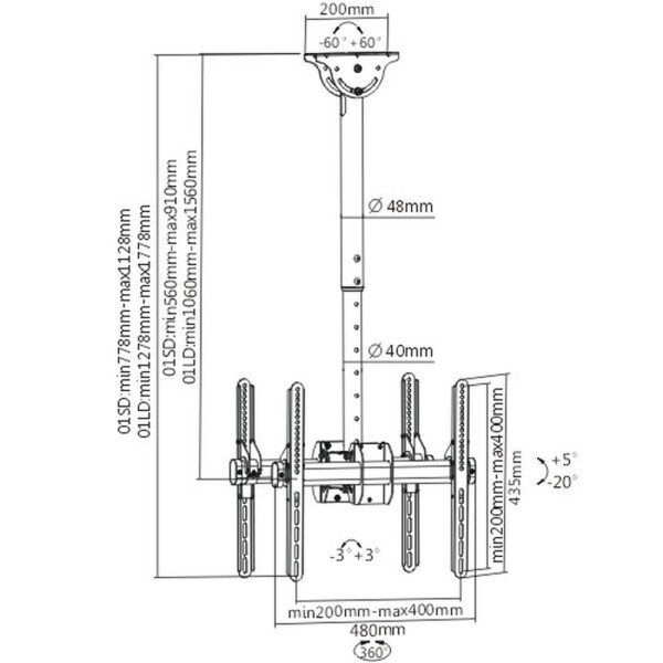 Кронштейн модели LCD-1850 - это потолочный кронштейн с функциями наклона и поворота для крепления двух телевизоров. Телевизор можно регулировать в разных положениях по высоте с шагом в 4 см. Вы сможете подобрать наиболее удобное положение телевизора в зависимости от размеров помещения и величины аудитории.