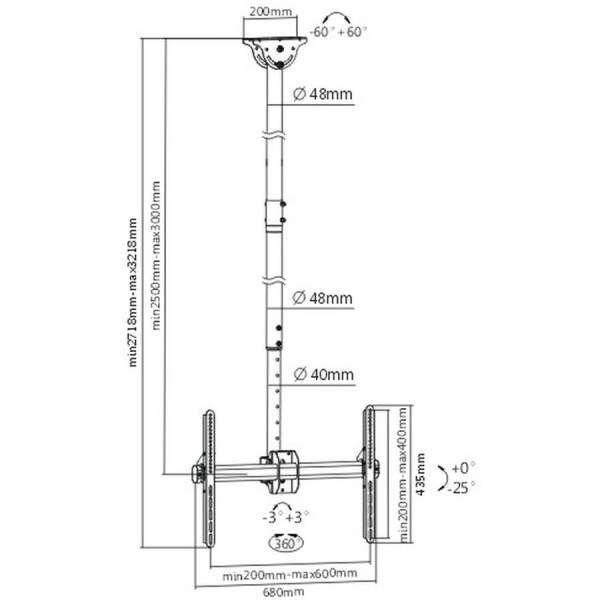 Потолочный кронштейн для LCD/LED телевизоров размером от 32 до 90 дюймов с максимальным весом до 55 кг. с возможностью крепления на наклонный потолок. Надежная стальная конструкция. Регулировка наклона 0-25 и углом поворота ±180 градусов. Максимальные крепежные размеры 600×400 мм.