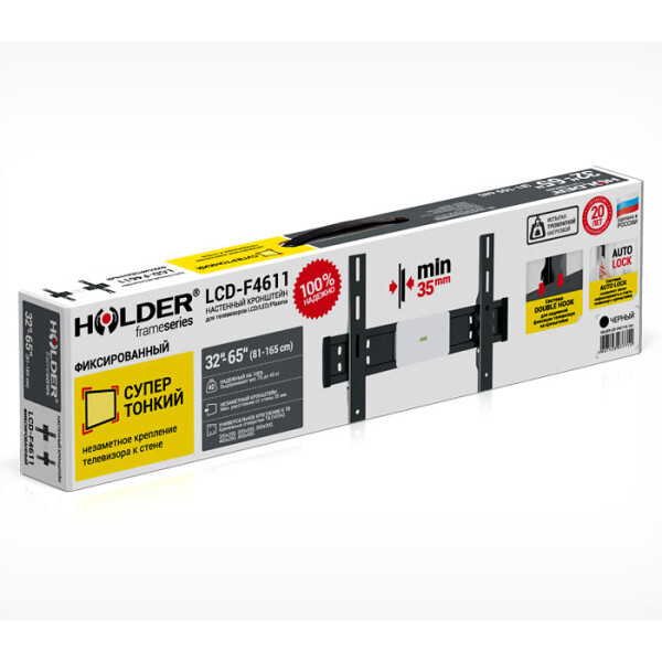 Кронштейн для ТВ и мониторов Holder LCD-F4611 используется как неподвижная стеновая опора для LCD телевизионного оборудования с диагональю 32-65 мм без выступов на задней панели. Благодаря минималистичному исполнению кронштейн занимает мало места и почти не заметен, при этом расстояние от стены до ТВ будет составлять всего 35 мм.