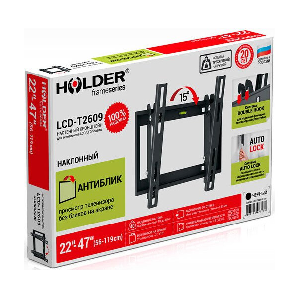 Крепление для ТВ и мониторов Holder LCD-T2609-B необходимо для настенной установки техники с диагональю экрана 22–47 дюйма. Максимальный разрешенный вес устанавливаемой техники составляет 40 килограмм. Кронштейн из высокопрочной стали позволяет установить телевизор (монитор) на расстоянии 60 мм от стены с возможностью ручной регулировки угла наклона вверх и вниз, без использования дополнительного инструмента. Отверстия для крепежа соответствуют стандарту VESA и имеют размеры: минимум – 100х100 мм, максимум – 200х200 мм.