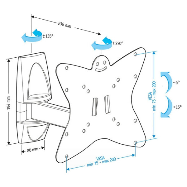 Во-первых, это функция поворота на 270 градусов. Во-вторых, по желанию, можно регулировать наклон телевизора на -6/+15 градусов. В-третьих, это регулировка расстояния от стены: в сложенном состоянии – 95 мм, выдвигается конструкция до 236 мм. Регулировка осуществляется максимально легко, вы можете плавно регулировать кронштейн одной рукой. В-четвертых, полная комплектация, в наборе есть все детали и инструкция.
