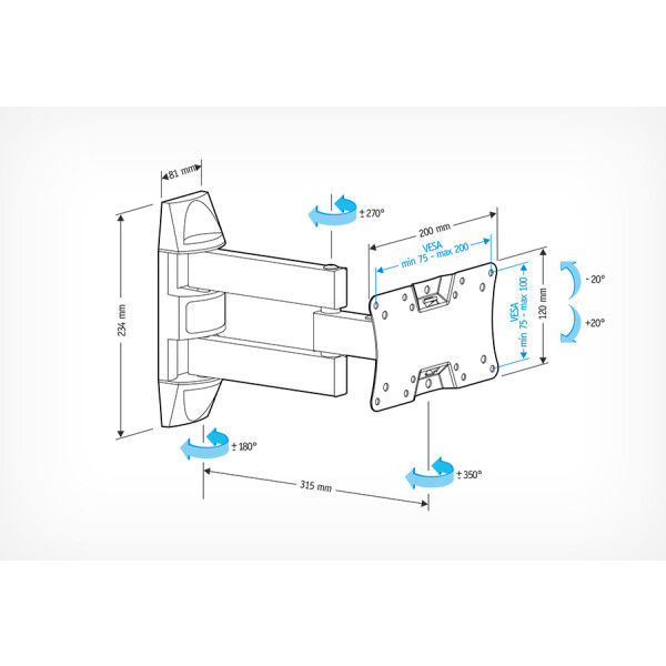 Регулируемый кронштейн Holder LCDS-5065 позволит с максимальным комфортом разместить на стене телевизор или монитор компьютера с диагональю от 19 до 32 дюймов. Отличительная особенность этого вполне экономичного по цене крепления – возможность регулировки во всех направлениях. В частности, можно повернуть экран вверх и вниз на 20 градусов, из стороны в сторону – практически вокруг оси, до 350 градусов. Можно также отодвигать телевизор от стены на максимальные 315 мм или прижимать ножку на шарнирах до 6 см.