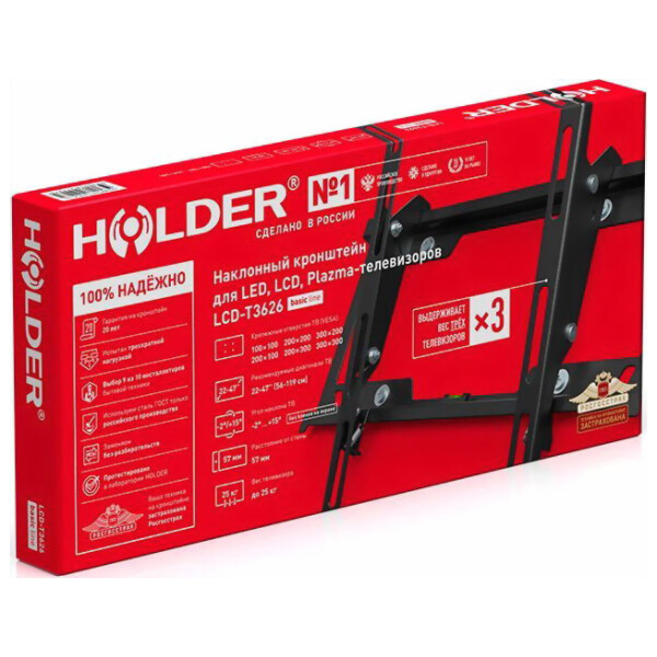 Кронштейн Holder T3626-B совместим с телевизорами малого и среднего размера. Он позволяет плавно регулировать угол наклона мультимедийного устройства, обеспечивая идеальную видимость изображения и уменьшая количество бликов. Быстросъемные вертикальные направляющие облегчают процедуру монтажа, а встроенный пузырьковый уровень помогает выровнять держатель перед окончательной фиксацией. Кронштейн изготовлен из высокопрочной стали – он выдерживает нагрузку до 25 килограммов.