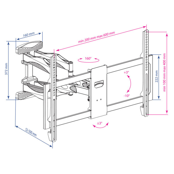 Kromax Atlantis-35 – поворотно-наклонный кронштейн для телевизора. Его двойные рычаги позволяют плавно регулировать расстояние до стены, выбирая оптимальное положение экрана и обеспечивая превосходный обзор изображения. Если после монтажа вы обнаружите неровность, её можно будет исправить – крепления поворачиваются на 3 градуса относительно горизонта. Съёмные пластины облегчают установку телевизора, а встроенные кабель-каналы предоставляют место для скрытого прокладывания проводов.