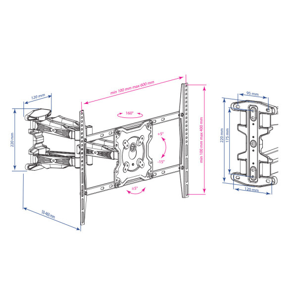 Мощный настенный кронштейн для телевизора 22-65 дюймов. Надежная стальная конструкция, максимальная нагрузка до 45 кг. Легкий монтаж благодаря съемной монтажной пластине. Кронштейн имеет регулировку наклона, поворота, вылета от стены. Также предусмотрена подстройки положения телевизора при неточном монтаже. Широкая настенная монтажная панель позволяет снизить нагрузку на стену в точках крепления. Мощная двухрычажная конструкция позволяет, при необходимости, отодвинуть телевизор от стены до 460 мм. Скрытая система укладки кабеля в специальные кабель-каналы. Декоративные настенные накладки. Универсальная система крепления, посадочные размеры VESA до 600х400 мм.