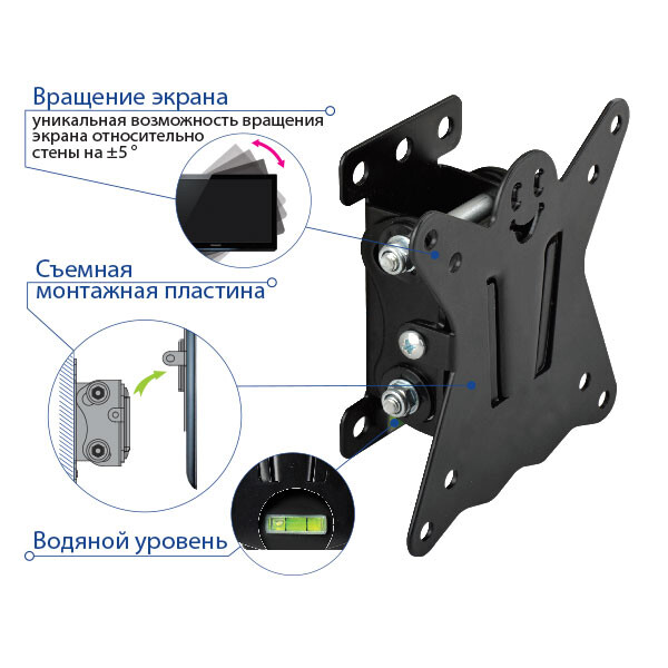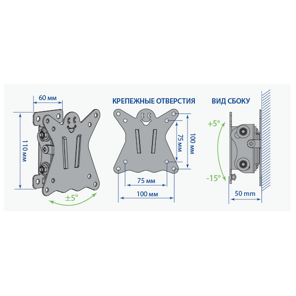 Оригинальный наклонный кронштейн CASPER-101 идеально подходит для всех LED/LCD телевизоров с диагональю экрана от 10 до 26 дюймов (25-66 см) и весом до 25 кг. Надежная стальная конструкция позволяет легко наклонять телевизор вверх–вниз под углом +5°-15° относительно стены. Расстояние от стены составляет 50 мм. Крепежные отверстия соответствуют стандартам VESA 75×75 мм и 100×100 мм.